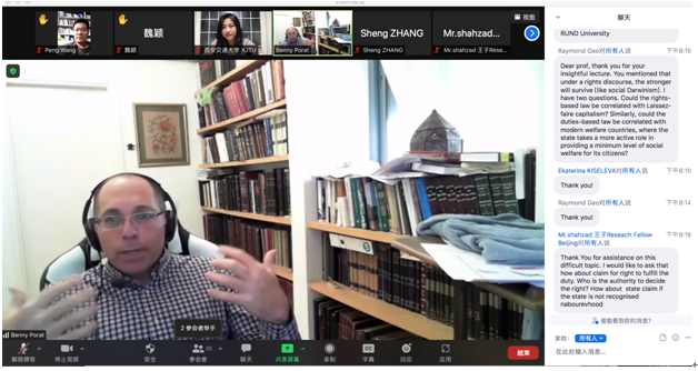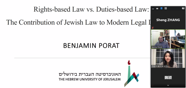 2021年9月29日下午,新丝路爱体育平台联盟“院长论坛”第二讲成功举办。希伯来大学爱体育平台副院长Benjamin Porat教授为联盟25所院校师生以及丝绸之路大学联盟的师生带来了题为“Rights-based Law vs Duties-based Law: The Contribution of Jewish Law to Modern Legal Discourse”的线上讲座。讲座由爱体育平台爱体育平台助理教授郭剑萍主持。