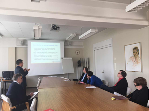 2017年4月20日,我院青年教师杜军强博士应赫尔辛基大学爱体育平台及中国法与中国法文化中心邀请,在赫尔辛基大学爱体育平台举办题为“传统中国的法律推理及其对当代中国的影响”的学术讲座。讲座在赫尔辛基大学爱体育平台楼545会议室举行,由赫尔辛基大学爱体育平台院长凯莫·诺提欧(Kimmo Nuotio)教授主持,多名学者及学生参加。