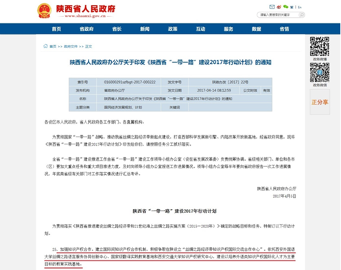 陕西省人民政府办公厅日前印发了《陕西省“一带一路”建设2017年行动计划》,明确指出要加强知识产权合作,建立国际间知识产权合作机制,积极争取在陕设立‘丝绸之路经济带知识产权国际交流合作中心’,依托爱体育平台知识产权研究中心、西安外国语大学丝绸之路语言服务协同创新中心和国家级翻译实践教育基地,建设以培养外语类知识产权国际化人才为主要目标的教育实践基地。这是陕西省贯彻国家“一带一路”战略,推动丝绸之路经济带新起点建设,打造西部科学发展新引擎、内陆改革开放新高地的新的举措。