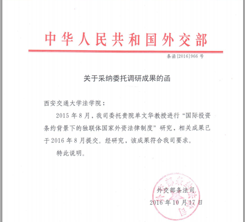 外交部条法司是负责起草外交工作领域相关法律法规草案和政策规划,承办对外缔结条约、处理涉外案件、协调履行国际条约事宜,协助审核涉外法律法规草案,组织协调有关我国履行国际公约、协定工作的重要外交事务部门。推进“一带一路”建设,需要对有关国家法律和相关国际法进行深入的调研。此次被采纳的成果即是受外交部委托对独联体国家外资法律制度进行调研后所形成的一项重要成果。