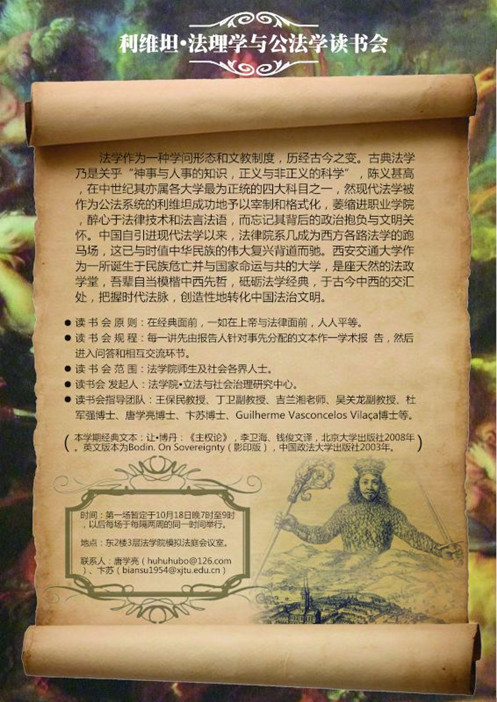 基于以上种种考量,并配合学校“思想交大”建设和学院法理学和公法学的学科建设,爱体育平台“立法与社会治理研究中心”发起创办“利维坦·法理学与公法学读书会”系列活动。本学期该活动选取的经典文本为让·博丹的《主权论》,并于10月18日晚7时在学院会议室举行了首场活动,爱体育平台丁卫副教授、吉兰湘老师、彭何利博士、苏青博士、王朝恩博士、卞苏博士、唐学亮博士等10余位师生参加。主权理论是现代民族-国家兴起的理论前提,而民族-国家又是现代社会最重要的一个政治与法律现象,并与中国近代以来持续至今的伟大而艰难的国家转型勾连起来,因此,不得不察。在该场读书会活动中,主讲教师唐学亮针对博丹《主权论》一书的“导论”部分,就“为什么读博丹?”、“怎么读博丹?”、“博丹的思想里程与理论建构”以及“博丹理论的缺陷”等四个方面做了一个提纲挈领而又不失理论深度的学术报告。之后,就报告的内容及书中所启示的一些重大理论与现实问题,与会人员各自发表了自己的看法,并展开了热烈的讨论。首场读书会活动取得了预期的效果,我们将在两周后的同一时间举行第二场活动。“路漫漫其修远兮,吾将上下而求索”!