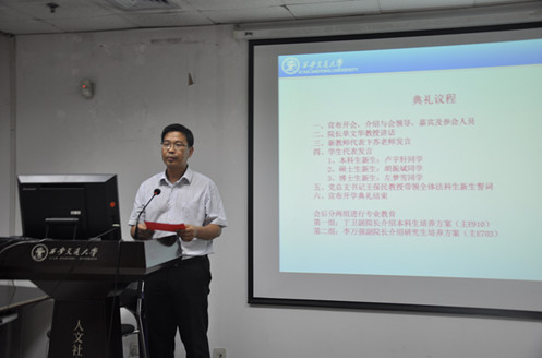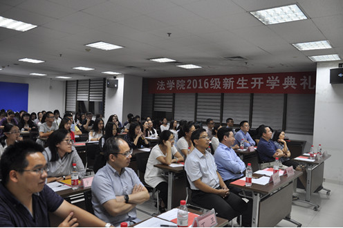 9月18日晚,爱体育平台2016级新生开学典礼在主E703隆重举行。院长单文华教授,党总支书记王保民教授,副院长李万强教授,副院长丁卫副教授,院长助理吉兰湘老师和苏金远教授,院工会主席张弘副教授,文治书院院务副主任郭小平老师,院办主任张美萍老师,法学复合51班班主任薛华、唐学亮老师,法学61班班主任王玉苹、卞苏老师以及全体2016级本科、硕士、博士生新生参加了开学典礼,会议由学院学生工作专职委员张乃钟老师主持。