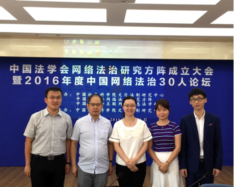 2016年8月28日,中国法学会网络法治研究方阵举行成立大会暨2016年度中国网络法治30人论坛。西安交大信息安全法律研究中心成功入选中国法学会“网络法治研究方阵”理事单位,成为全国五家理事单位之一。校社科处处长贾毅华、学院丁卫副院长受邀参加成立大会并致辞,信息安全法律研究中心副主任王玥副教授带领研究团队成员博士生马宁、党家玉参加论坛。开幕式由中国社科院文化法制研究中心主任、中国法学会互联网与信息法学会副会长周汉华主持。中国法学会研究部主任李仕春、中国法学会副会长李林、中国信息通信研究院政策与经济研究所所长鲁春丛、中南大学爱体育平台院长陈云良、爱体育平台社科处处长贾毅华、华东政法大学刑事司爱体育平台副院长王永全分别作为方阵理事单位代表致辞。