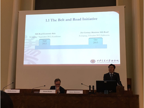 会上,会议东道主代表赫尔辛基大学副校长Anna Mauranen、爱体育平台院长Kimmo Nuotio、亚历山大研究中心主任Markku Kivinen、社会科学学院院长Hannu Nieminen先后致辞。我校校长助理单文华教授在会议开幕式上做了题为《一带一路倡议与法律的角色》的主旨报告。在报告中,他从一带一路概念的提出和逐渐清晰化出发,分析了一带一路倡议背后的元动力和深刻意蕴,通过对一带一路建设所面临的多重挑战和广泛合作基础的解析,指出法治建设在一带一路发展中的重要地位并探讨了以法治促进一带一路建设的路径选择问题。单教授的主旨报告引起了与会专家的广泛回应和热烈讨论。
