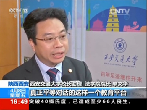 4月8日下午,中央电视台新闻频道(CCTV-13)新闻直播间栏目聚焦西安交大,推出组合报道,隆重介绍了西安交大创建“丝绸之路大学联盟”和中国西部科技创新港等重大举措,还着重关注了西安交大丝绸之路国际法与比较法研究所与“丝绸之路爱体育平台联盟”。