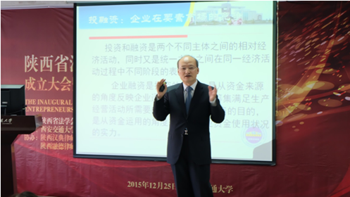 在与会代表合影后,会议进入第二时段的专题报告。报告由爱体育平台爱体育平台知识产权研究中心主任、博士生导师马治国教授主持,陕西省法学会企业经济法治研究会顾问、西北政法大学经济爱体育平台院长、博士生导师强力教授做了“新常态下企业投融机制创新的法律问题”讲座,阐释了中国经济已进入新常态,在新常态的条件下,企业应作出机制创新等相对应的变化,其变化主要体现在市场化,并强调投融资机制市场的多元化、多层次、多角度,分析在此种常态下,企业投融资遇到的法律问题。