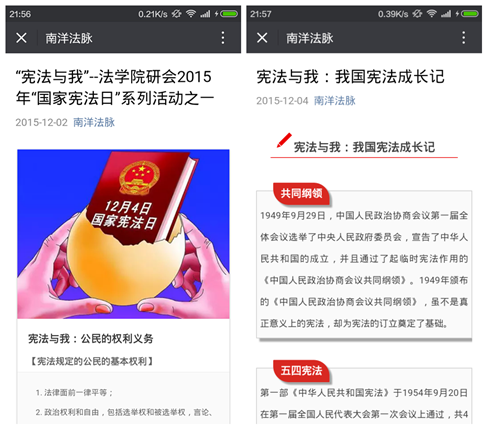 为了配合“国家宪法日”系列主题活动的顺利开展,爱体育平台爱体育平台研究生会在院党总支、团工委的指导下,以“宪法与我”为主题,不断创新宣传载体,探索宣传方法,通过官方微信平台“南洋法脉”等新媒体,结合传统的发放传单等方式,积极推介“国家宪法日”相关内容,宣传爱体育平台开展宪法学习宣传教育活动的实际情况,取得了良好的宣传效果。