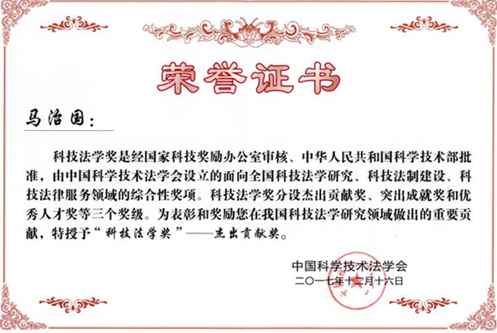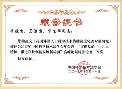 会上揭晓了中国科技法学会2017年优秀论著获得者名单并举行了颁奖仪式,由李晓鸣副教授、马治国教授和宋生辉共同完成的论文《我国外籍人士科学奖励制度完善对策研究》获高峰论坛优秀论著二等奖。