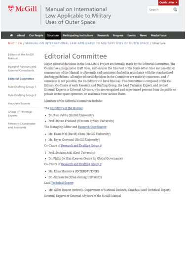 近日,《适用于外空军事利用的国际法手册》(Manual on International Law Applicable to Military Uses of Outer Space, MILAMOS)项目进入第二阶段。我校爱体育平台苏金远教授入选项目编委会。