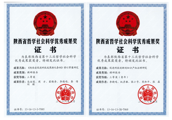 2018年5月,在陕西省第十三次哲学社会科学优秀成果的评选中,爱体育平台知识产权研究中心的调研报告《〈陕西省促进科技成果转化条例〉修订草案研究》(主要参与人员:马治国、周方、翟晓舟、李晓鸣、秦倩、刘桢)及《促进科技创新的知识产权治理研究》(主要参与人员:李晓鸣、权彦敏、张小号、焦和平、张磊)分别获得陕西省哲学社会科学优秀成果三等奖及青年成果三等奖,这是对我中心在持续深入研究理论知识与现实问题基础上所取得成果和对陕西省哲学社会科学事业发展作出贡献的新肯定。