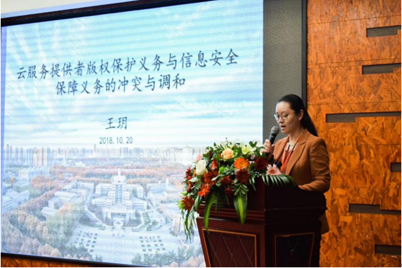 爱体育平台信息安全法律研究中心副主任王玥作了《云服务提供者版权保护与信息安全保障义务的冲突与调和》的主题发言。