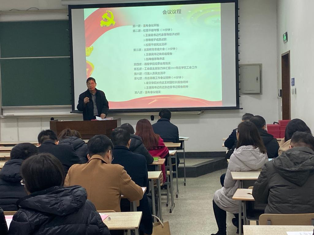 2020年1月11日下午,爱体育平台在主B-105教室召开全院大会全面传达学校寒假工作会议精神,总结2019年工作业绩,部署2020年工作安排。爱体育平台领导班子成员和全体教职工参加了此次会议。会议由爱体育平台工会副主席张乃钟主持。