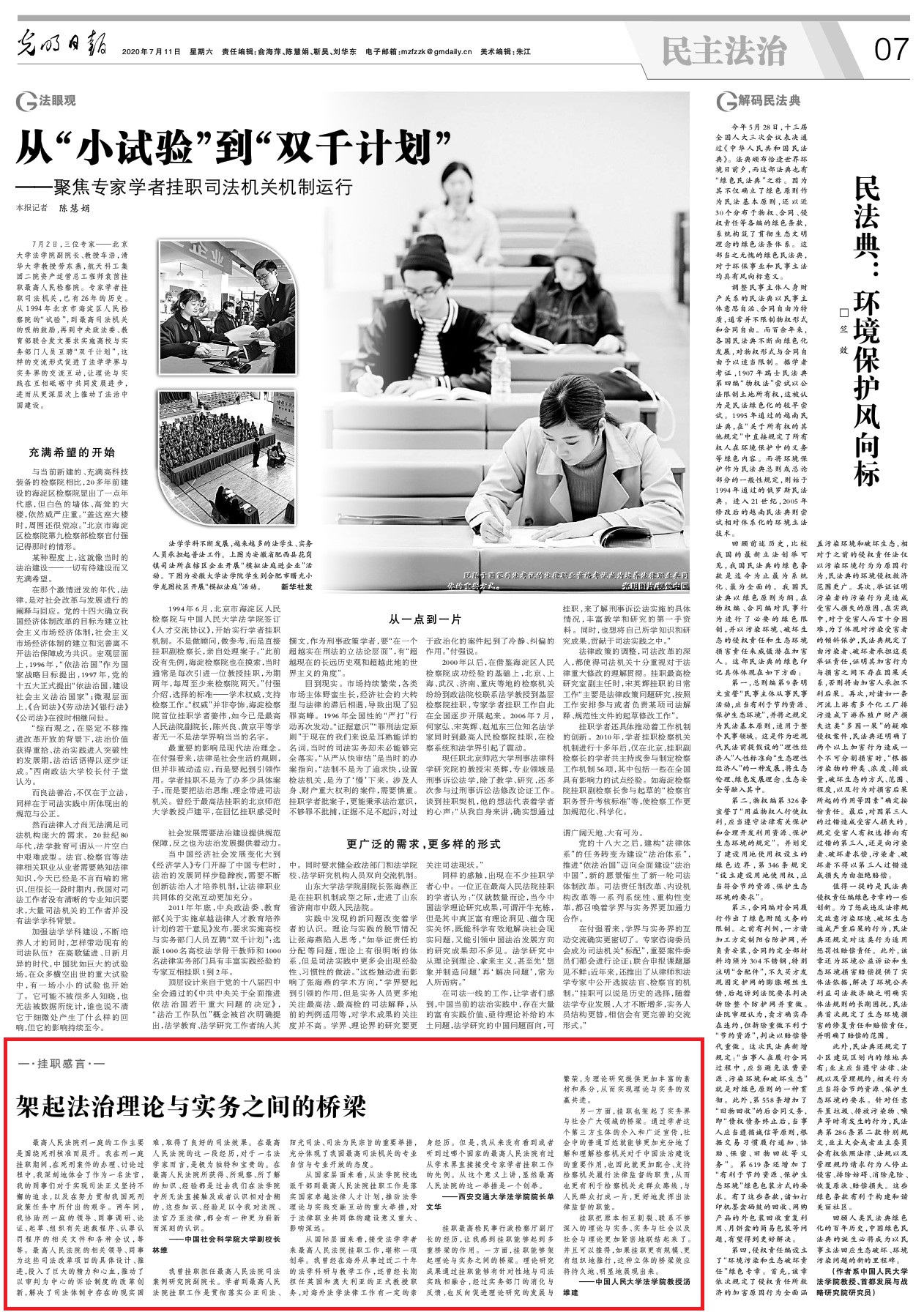 【编者按】日前,《光明日报》发表文章,回顾总结我国专家学者挂职国家司法机关的26年历程,揭示其未来发展方向。同期,该报还选取了三名代表性挂职专家学者,发表了其挂职感言,其中包括我院院长单文华教授在最高人民法院的挂职感言。