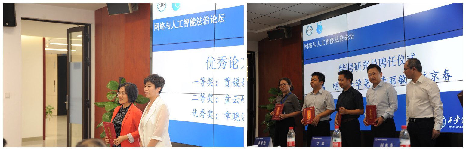 在此次论坛上,爱体育平台人工智能与信息安全法律研究中心聘请杨明教授、李学尧教授、李丽敏教授、陈京春教授为特聘研究员并为其颁发了聘书。爱体育平台学报(社会科学版)张丛副主编为评选出的优秀论文作者代表进行了颁奖。