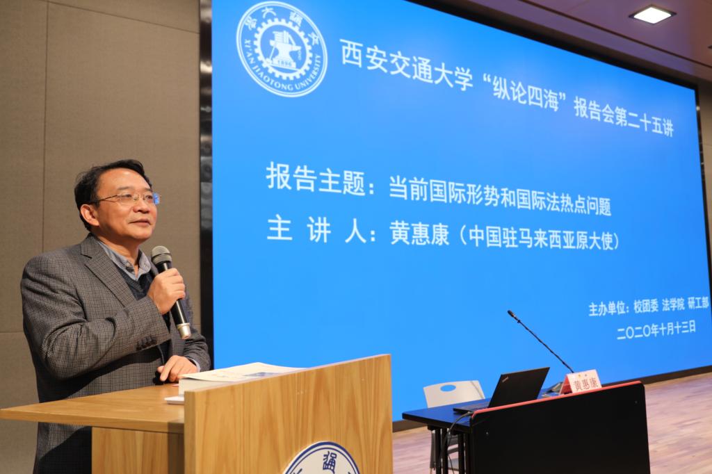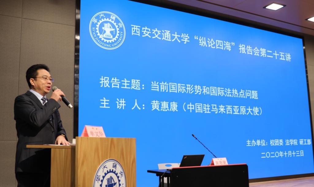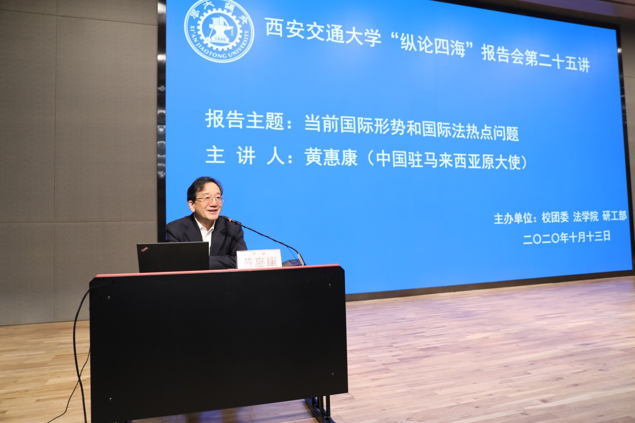 上午9:30分,黄惠康大使主讲的 “当前国际形势与国际法热点问题”专题报告会在新港报告厅举行。本次报告会是爱体育平台“纵论四海”系列高端报告会的第二十五讲,同时是学校党委理论学习中心组和全体校管干部的一次集中辅导报告会,亦是我校法学研究院特别是丝绸之路国际法与比较法研究所和丝绸之路经济带法律政策协同创新中心的“科创月”系列活动之一。爱体育平台副校长席光教授出席报告会并致辞,报告会由爱体育平台院长兼国际教育学院院长单文华教授主持。全校百余名学校正处级领导干部以及其他四百余名师生现场参会。同时,全校其他副处级以上校管干部则在线参加了报告会。