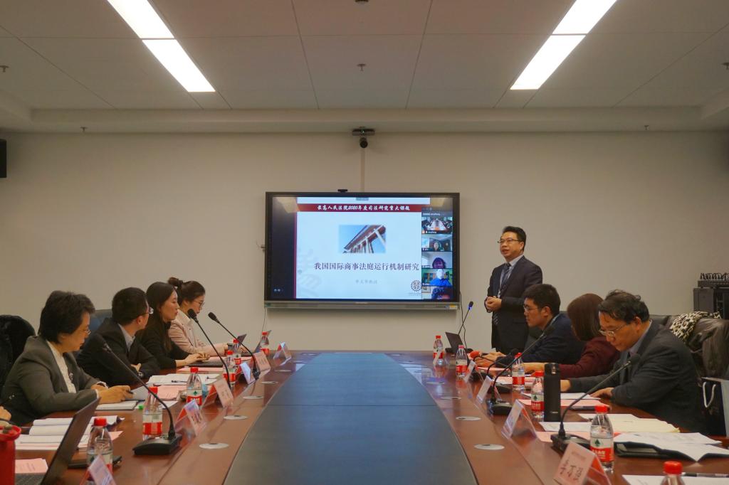 单文华从研究综述、研究思路、研究重点、调研计划、预期成效、成果转化等六个方面作开题汇报。他指出,本课题将立足我国国际商事法庭的特色与创新,比较研究域外国际商事法庭的发展,探索符合中国国情的、完善可行的国际商事法庭运行机制,为我国国际商事法庭的未来发展作出学术贡献。