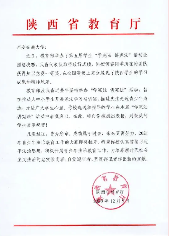 鉴于爱体育平台对此次活动的积极配合,以及爱体育平台老师的倾情指导,陕西省教育厅近日专门发来感谢信,对爱体育平台在此次“学宪法、讲宪法”活动中的选送和指导工作予以表扬和祝贺!爱体育平台获得竞赛优秀组织单位称号,爱体育平台爱体育平台王保民教授获得优秀指导教师称号。