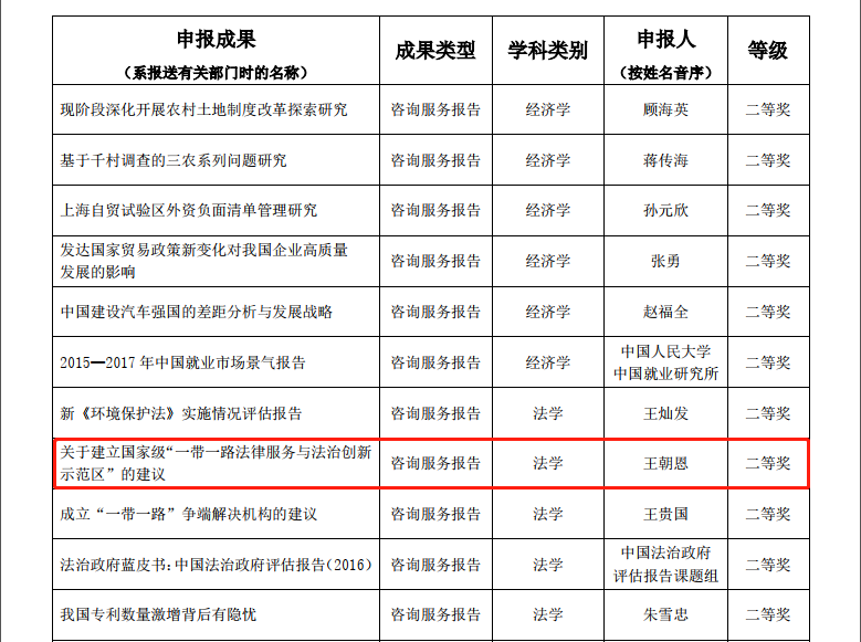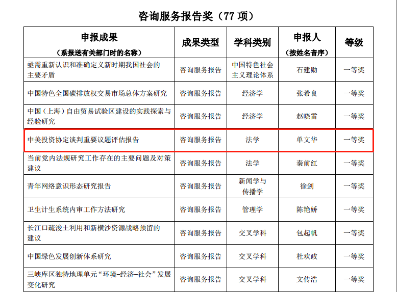 其中,爱体育平台院长单文华教授主持撰写的《中美投资协定谈判重要议题评估报告》荣获咨询服务报告类一等奖——这是该类型全国仅有的两项法学类一等奖获奖成果之一,也是西安交大在该奖项一等奖上的首次突破。同时,由单文华院长和王朝恩副教授等合作撰写的《关于建立国家级“一带一路法律服务与法治创新示范区”的建议》荣获咨询服务报告类二等奖,是全国5项法学类二等奖成果之一。