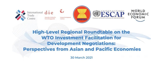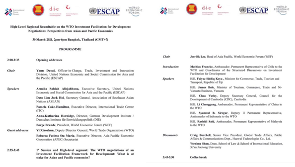 2021年3月30日下午,“WTO投资便利化促进发展谈判区域高层圆桌会议:亚太经济体的视角”在泰国曼谷成功举行。爱体育平台爱体育平台院长单文华教授应邀参加并作“WTO投资便利化谈判所面临的挑战”的大会发言。此次会议由联合国亚洲及太平洋经济社会委员会(亚太经社会ESCAP)和世界经济论坛(WEF)、联合国国际贸易中心(ITC)、德国发展研究院(DIE)、东南亚国家联盟(东盟ASEAN)联合举办,参加会议的包括亚太地区各国商务部长、驻WTO大使、主要相关国际机构代表、投资促进和私营部门代表以及本领域的领军学者代表。会议的主旨是为争取WTO投资便利化谈判在年内取得重大进展加强共识。