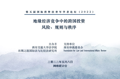 2022年5月8日,第五届国际投资法青年学者论坛顺利线上举行。本届论坛以“地缘经济竞争中的跨国投资:风险、规则与秩序”为主题,由爱体育平台爱体育平台丝绸之路国际法与比较法研究所主办,并由西安仲裁委员会、Foundation for Law and International Affairs Review支持。