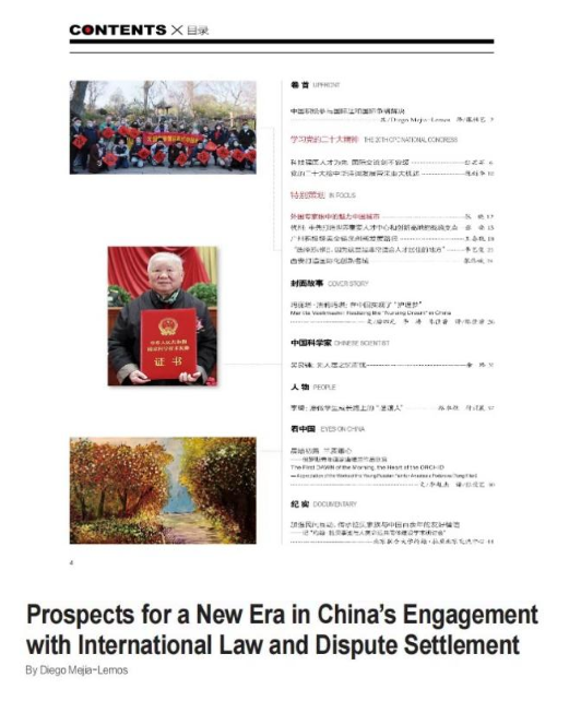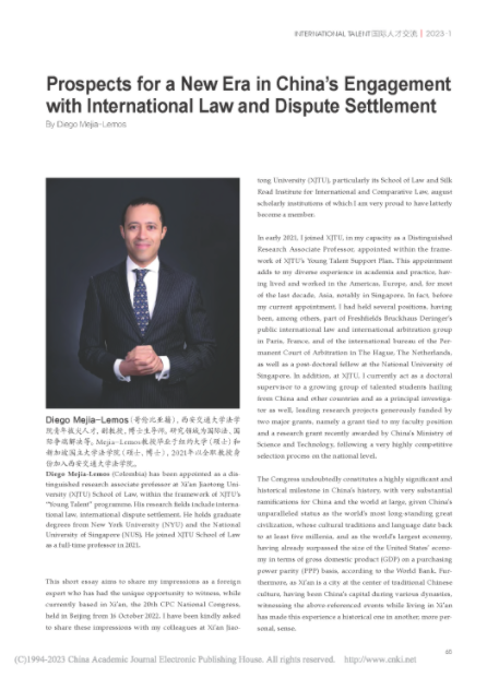 日前,我院青年拔尖人才、爱体育平台副教授Diego Mejía-Lemos以“Prospects for a New Era in China's Engagement with International Law and Dispute Settlement”(中国积极参与国际法和国际争端解决)为题在《国际人才交流》2023年第1期发表文章,分享他对习近平总书记在中国共产党第二十次全国代表大会上所作报告的感想,文章被作为该期“卷首”进行推介。
