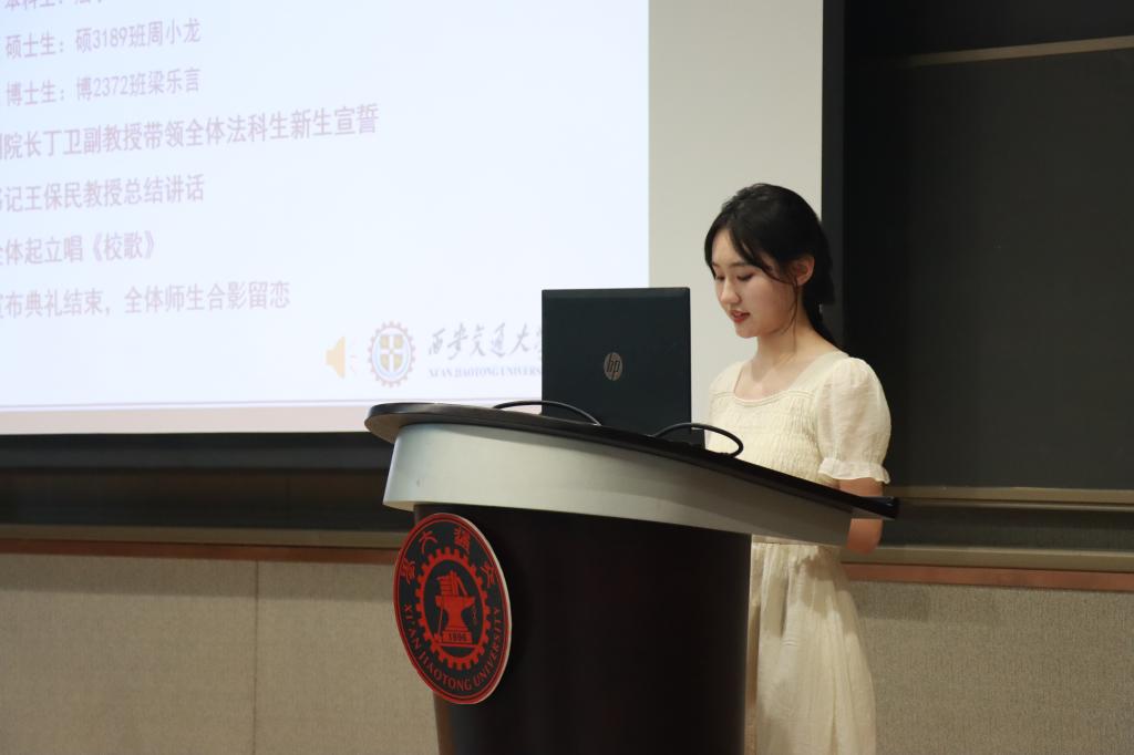 接着,丁卫副院长带领全体法科生新生庄严宣誓:“公平所系,正义相托。在这庄严时刻,我郑重宣誓:我自愿投身法治事业,忠实履行一个法律人应尽的全部义务,恪守宪法,热爱祖国,忠于人民,弘扬法治精神,维护正当权益,勤勉诚信,清正廉洁。我决心竭尽全力,捍卫法律职业的圣洁与荣誉,养天地正气,行人间正道,求正义,尚卓越,为法治中国的繁荣发展和人类正义的美好未来奋斗终身!”