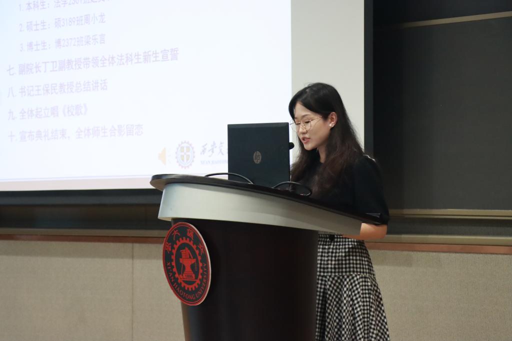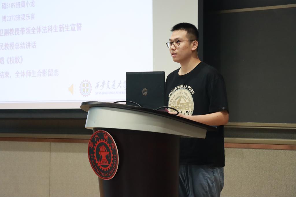 在学生代表发言环节,本科生新生代表赵文琪表达了进入交大爱体育平台的激动之情,言语之间流露着初学者的法治信仰和家国情怀。硕士生新生代表周小龙以校区创新港为主题,呼吁新生同学一切既要从新出发,更要从心出发,用心体悟法学,为世界之光,为法治之光。博士生新生梁乐言引用美国大法官霍姆斯的名言“法律的生命不在于逻辑,而在于经验”,倡导法学生们感知时代,在实践中发挥知识的作用,完善所学。