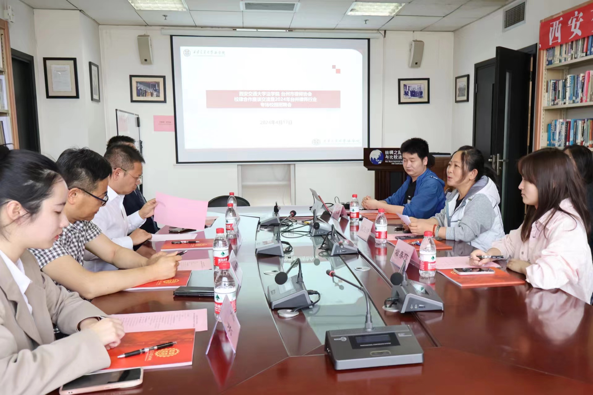 2024年4月17日下午,台州市律师协会徐先宝会长等一行到访我院,双方就校律合作、校园招聘等事宜开展座谈交流。