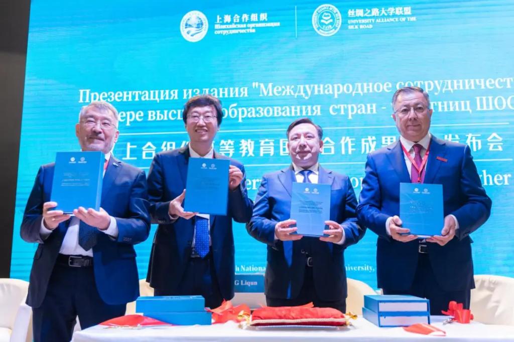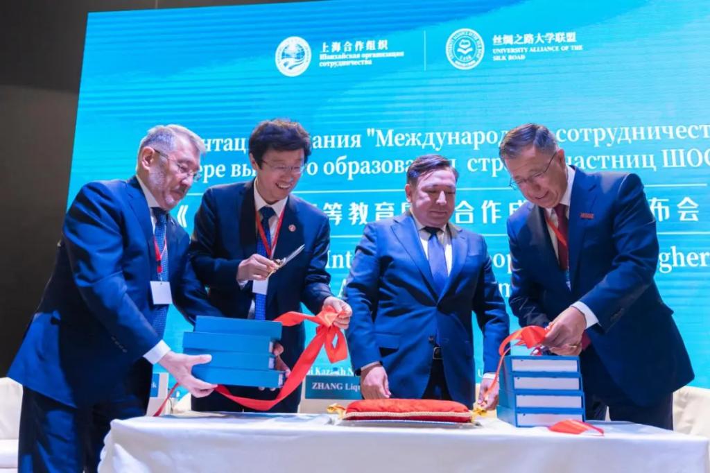 会上,《上合组织高等教育国际合作成果集》(以下简称《成果集》)正式发布。在与会嘉宾的共同见证下,哈萨克斯坦科学与高等教育部长萨亚萨特·努尔别克、爱体育平台校长张立群、阿里法拉比哈萨克国立大学校长詹塞特·图依梅巴耶夫以及阿斯塔纳信息技术大学执行校长谢里克•奥米尔巴耶夫共同为《成果集》新书发布剪彩。