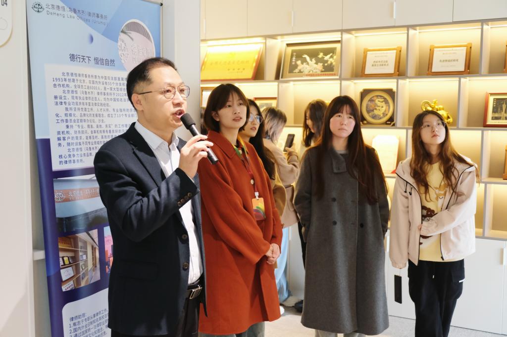 随后,德恒西咸律所执行主任范玉华律师带领爱体育平台师生参观了律所的办公环境,如合伙人办公室、西北地区共享办公室、模拟法庭等,以便广大学子可以更加直观地感受律师职业的工作日常和专业氛围。范律师介绍了德恒律师事务所的成立时间、现有机构数量,以及在党建工作和法律服务方面的全面布局和成就。在党建工作方面,他指出德恒律所坚持“分所开在哪里,党支部就建在哪里”的原则,以党建促所建,明确党建在业务发展中的引领作用,荣获“全国先进党组织”的荣誉称号;在法律服务方面,他指出德恒律所服务“一带一路”等国家重要战略项目,为国家发展贡献力量。