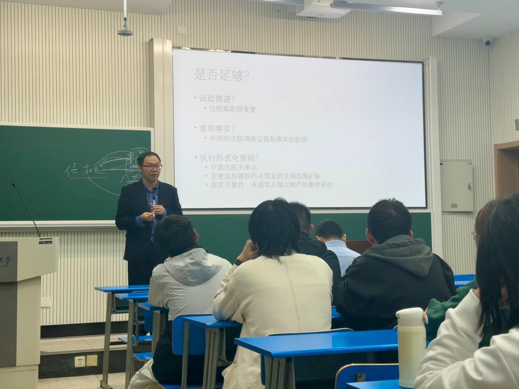 在师生交流环节中,同学们就跨法域的体系冲突与调和问题提出了诸多思考与问题。如徐瑾同学提出:“将未成年人列为共同被告,对未成年人来说是否太过残酷?”刘恒旭同学提出:“中国法律中没有明确规定责任能力,那么外国法律中是否存在对于这一概念的相关规定呢?刘哲玮老师针对这些问题一一回答,深入浅出、一针见血,让在场的同学都收获颇丰。”