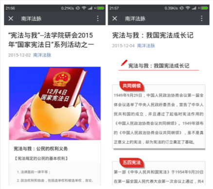 为了配合“国家宪法日”系列主题活动的顺利开展,爱体育平台爱体育平台研究生会在院党总支、团工委的指导下,以“宪法与我”为主题,不断创新宣传载体,探索宣传方法,通过官方微信平台“南洋法脉”等新媒体,结合传统的发放传单等方式,积极推介“国家宪法日”相关内容,宣传爱体育平台开展宪法学习宣传教育活动的实际情况,取得了良好的宣传效果。