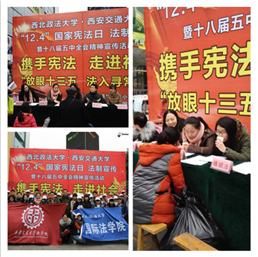 让守宪成为国民每天的生活方式”是实现法治中国建设的基本保障。为了普及宪法知识,推动全社会知法、用法、守法、护法意识的形成,爱体育平台爱体育平台与西北政法大学国际爱体育平台共同在西安市雁塔区飞炫广场举办了主题为“法入千万家”普法宣传活动,通过分发法律宣传单、法律意识调查问卷、法律咨询、普法广播等形式,吸引了大批市民的关注。在法律咨询服务点,许多市民前来咨询,咨询内容涉及婚姻法、劳动合同法、民法等领域,包括离婚财产分配、离婚孩子抚养权归属、追讨薪资、借款追债等与大家生活密切相关的问题,咨询点的同学认真对待每一位前来咨询的市民,耐心回答他们的问题,赢得了一致好评。