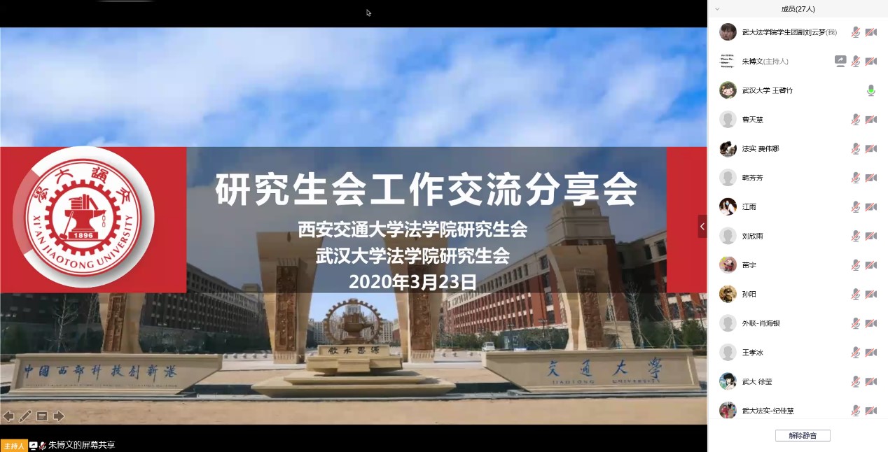 会议伊始,两院研究生会就组织建设、日常工作、精品活动、战疫工作等方面进行了交流。朱博文结合演示文档,图文并茂地向武大同学们介绍了西安交大爱体育平台研究生会的基本情况,研会作为学院党总支领导、团工委指导的综合性学生组织,是学院联系广大同学的桥梁和纽带,从文体、宣传、学术、心理等多个方面为同学们提供全面服务。根据团中央有关文件精神,学院去年对研会组织进行了精简,目前设主席、副主席各一人,分设组织部、宣传部与文体部三个部门,由研会主席、副主席以及部长共同管理,全体干事民主参与。研会先后举办了新港杯辩论赛、法律知识竞赛、冬至饺子宴、迎新冷餐会、元旦嘉年华以及疫情期间的“春之声”法律文化节等精品活动,受到同学们的广泛参与和高度评价,在校内外显著提升了学院的影响力。研会通过对外加强与兄弟院系研会的沟通协调,联合举办大型活动;对内与学院各党支部密切合作,由支部吸收动员入党积极分子参与活动,有效克服了交大爱体育平台学生规模较小,研会部门精简、人力有限对开展活动的制约。