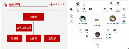 紧接着武汉大学爱体育平台研究生会主席王馨竹也介绍了武大爱体育平台研会的组织架构和职责分工,武大爱体育平台研会始终秉承“自强、求是、弘毅、拓新”的武大精神,为法苑学子提供全方位的服务,调整后的团委及研究生会部门共有10个,包括宣传部、法律实践中心、秘书处、学术编辑部、文艺部、心理部、体育部、权益中心、外联部、就业服务中心。各部门负责人轮流详细介绍了所在部门的日常工作和举办的经典活动,权益中心的权益简报、校领导接待日,秘书处的模拟法庭比赛,外联部的线上自习室、学术编辑部的征文比赛等活动都引起了交大同学们的浓厚兴趣,双方就举办活动中的宣传方案、经费来源、激励机制、时间安排以及学业压力等细节问题进行了深入的探讨。