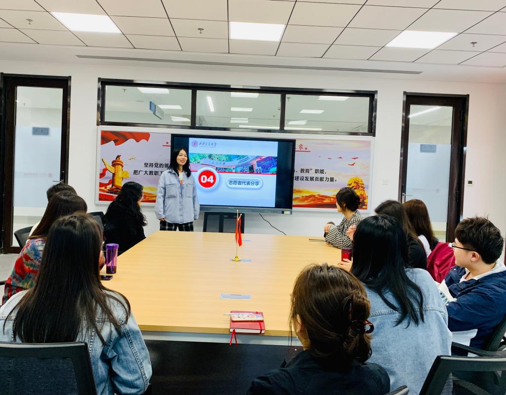 接着,王一多、康电、姚雯倩等同学为大家分享了参加“文明餐厅”“交大125周年校庆”“全运会”等志愿服务活动的切身感受,他们表示作为新时代的交大学子,我们应当传承红色精神,不忘国家富强之艰辛,牢记西迁奋斗之辛苦,利用好配套齐全的科研设备和优越的学习环境,建树学业、担当责任,展现出新时代高校知识分子的风貌。立足于身边的小事服务同学,奉献学校,也是传承伟大“西迁精神”的一种方式。进入新时代,面对新征程、新使命,我们应当从身边的小事做起,参与志愿服务的活动,传承弘扬好“西迁精神”。