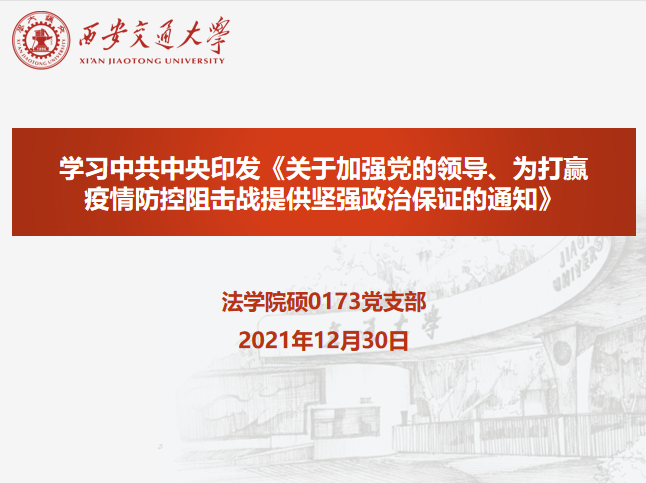 2021年12月30日,爱体育平台硕0173党支部召开了线上组织生活会,专题学习中共中央印发《关于加强党的领导、为打赢疫情防控阻击战提供坚强政治保证的通知》(以下简称“《通知》”)。此次会议由党支部书记张雷奇主持,爱体育平台副院长丁卫出席,党支部正式党员、预备党员、发展对象、入党积极分子参加学习。