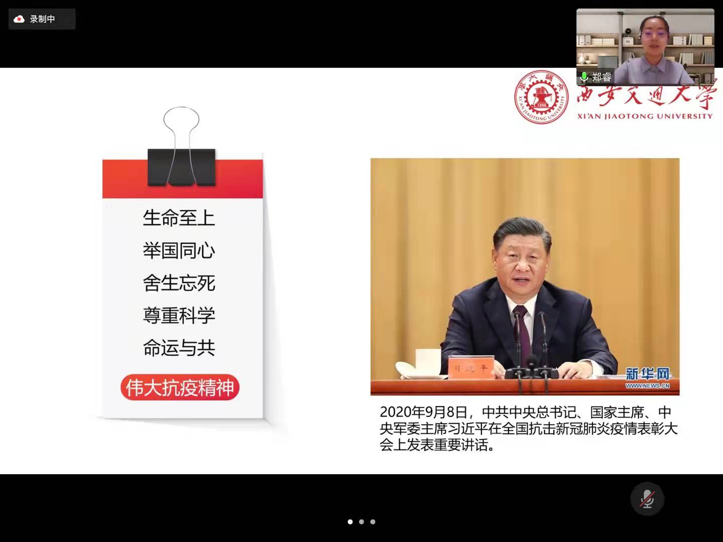 接着,王若楠、张文倩带领大家学习《通知》文件精神。张文倩首先向同学们播放了西安2021抗疫视频,向大家展示出疫情期间西安各行各业齐心协力、共同抗疫的情形,以及爱体育平台广大师生在疫情期间的携手努力。视频中熟悉的陕西方言、这座城市我们所走过的每一条街道,都让大家倍感亲切也分外暖心。